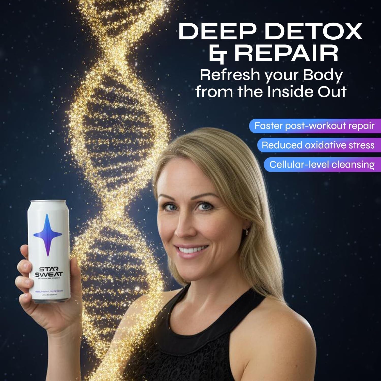 Star Sweat delivers advanced hydration for youthfulness, clarity, and vitality. Ultra-purified water with naturally occurring electrolytes is elevated with hydrogen, gold, and platinum, working at the cellular level to detoxify, energize, and rejuvenate from within.